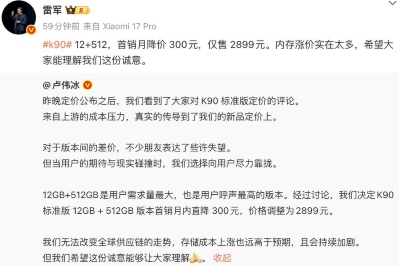 雷軍也在微博上回應紅米K90定價太高,原因就是因為“內存漲價實在太多”。